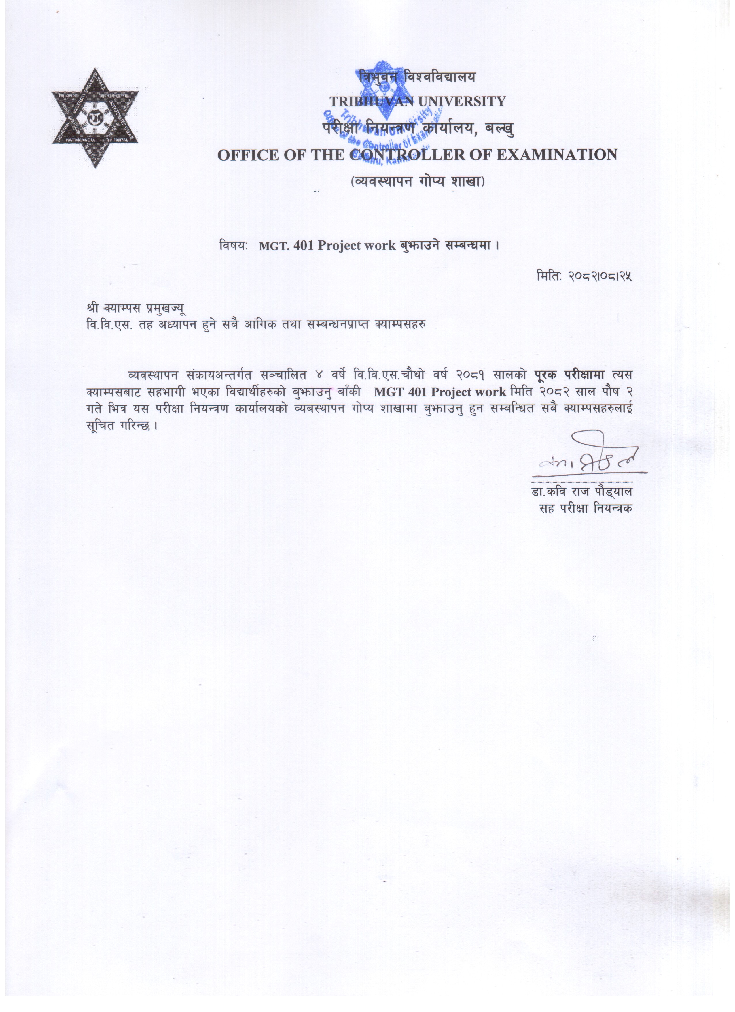 4 Yrs BBS 4th Year-2081 Partial Exam -MGT 401 Project Work बुझाउने सम्बन्धमा