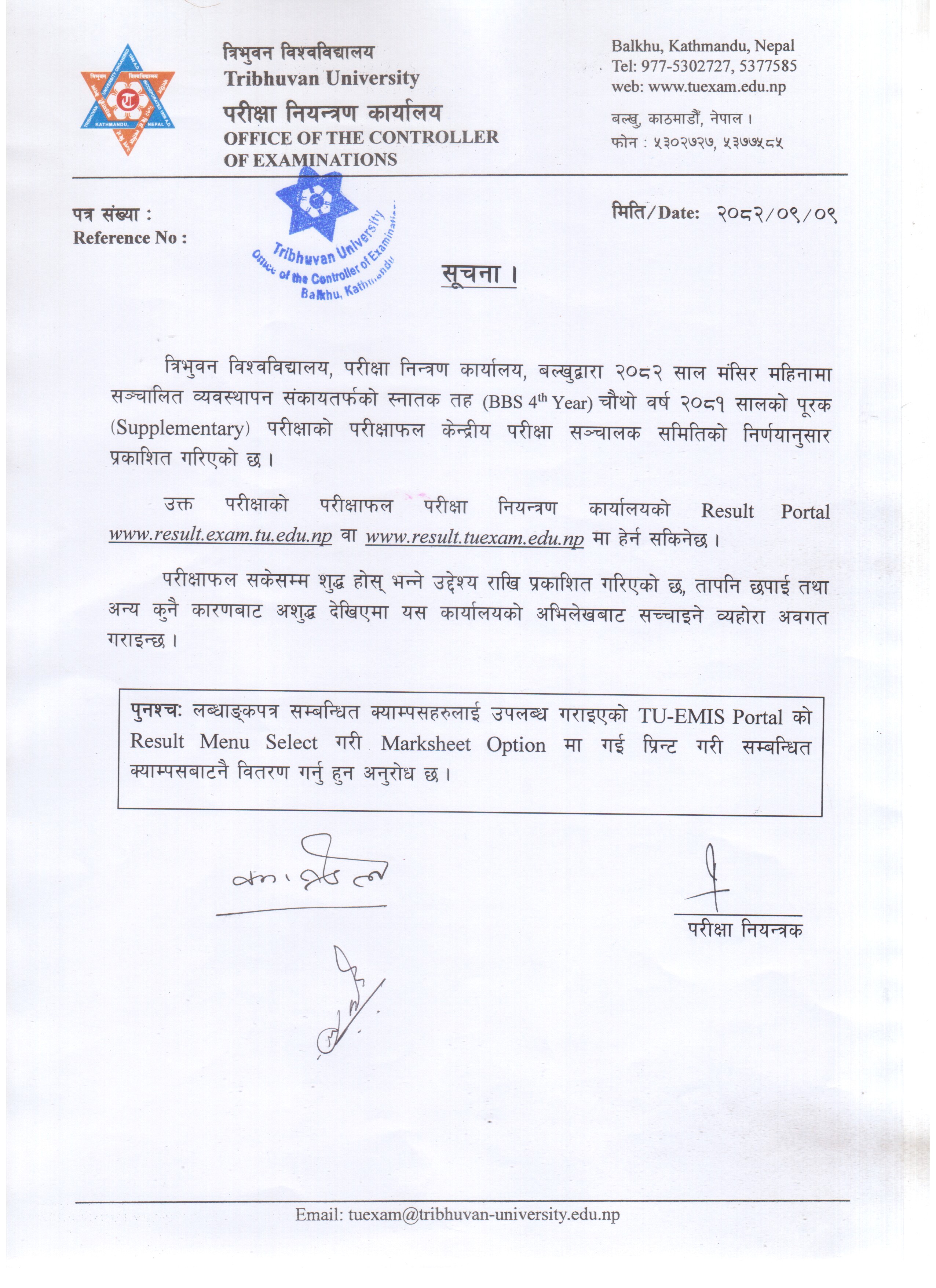 4-Years BBS Fourth Year Supplementary 2081 Result Published Notice