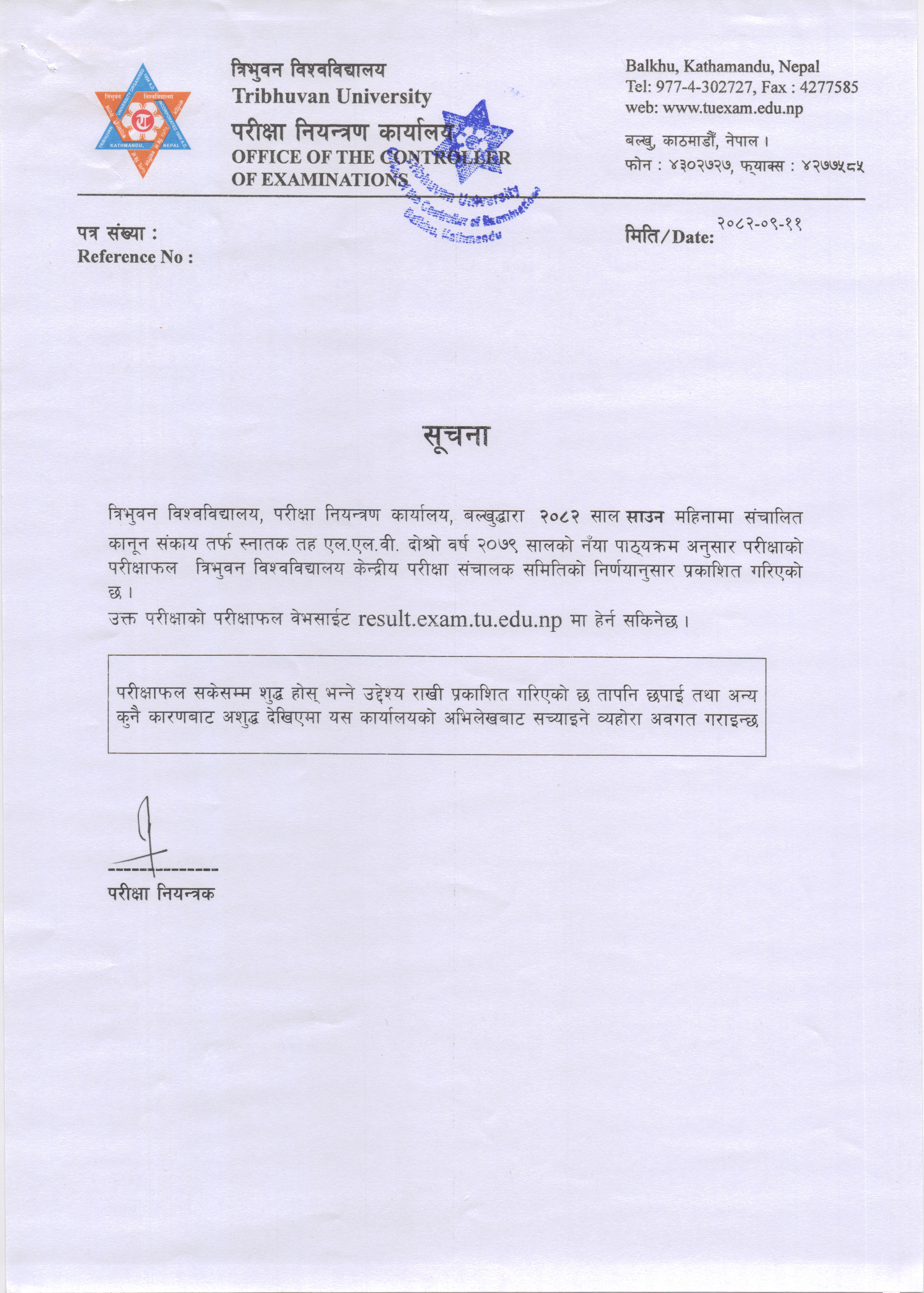 एल.एल.वी. दोश्रो वर्ष २०७९, नँया पाठ्यक्रमको २०८२ साउन महिनामा संचालित परीक्षाको नतिजा प्रकाशन सम्बन्धी सूचना ।