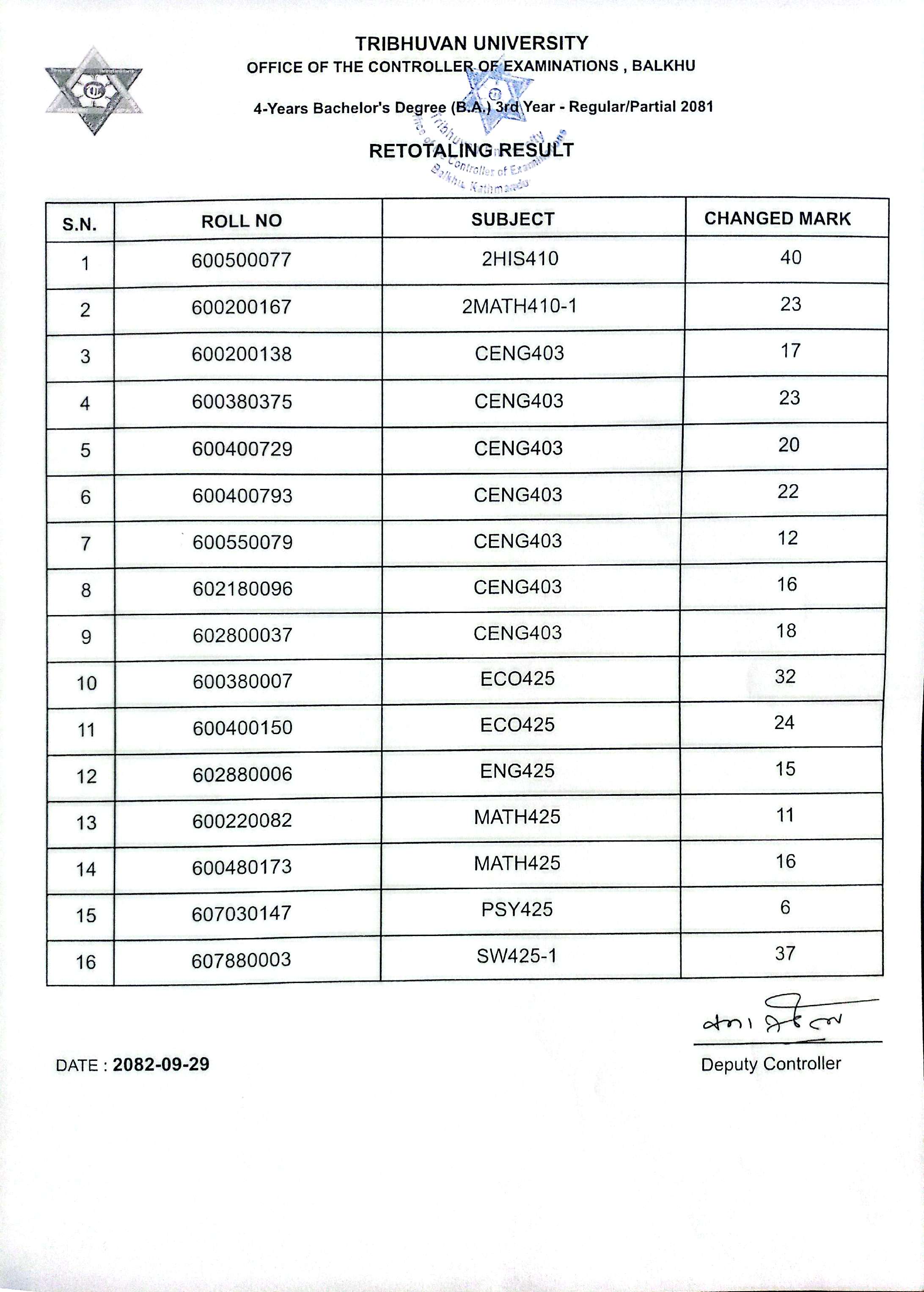 4-Years Bachelor's B.A. Third Year Regular/Partial 2081 Retotaling Result Published Notice
