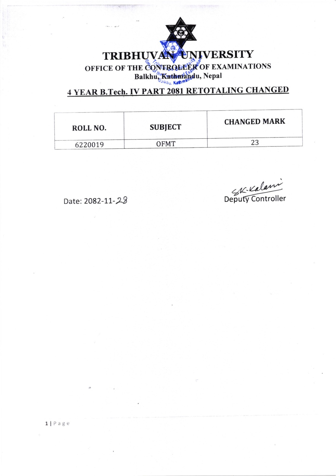4 Year B.Tech. IV Part 2081 Retotaling Result.