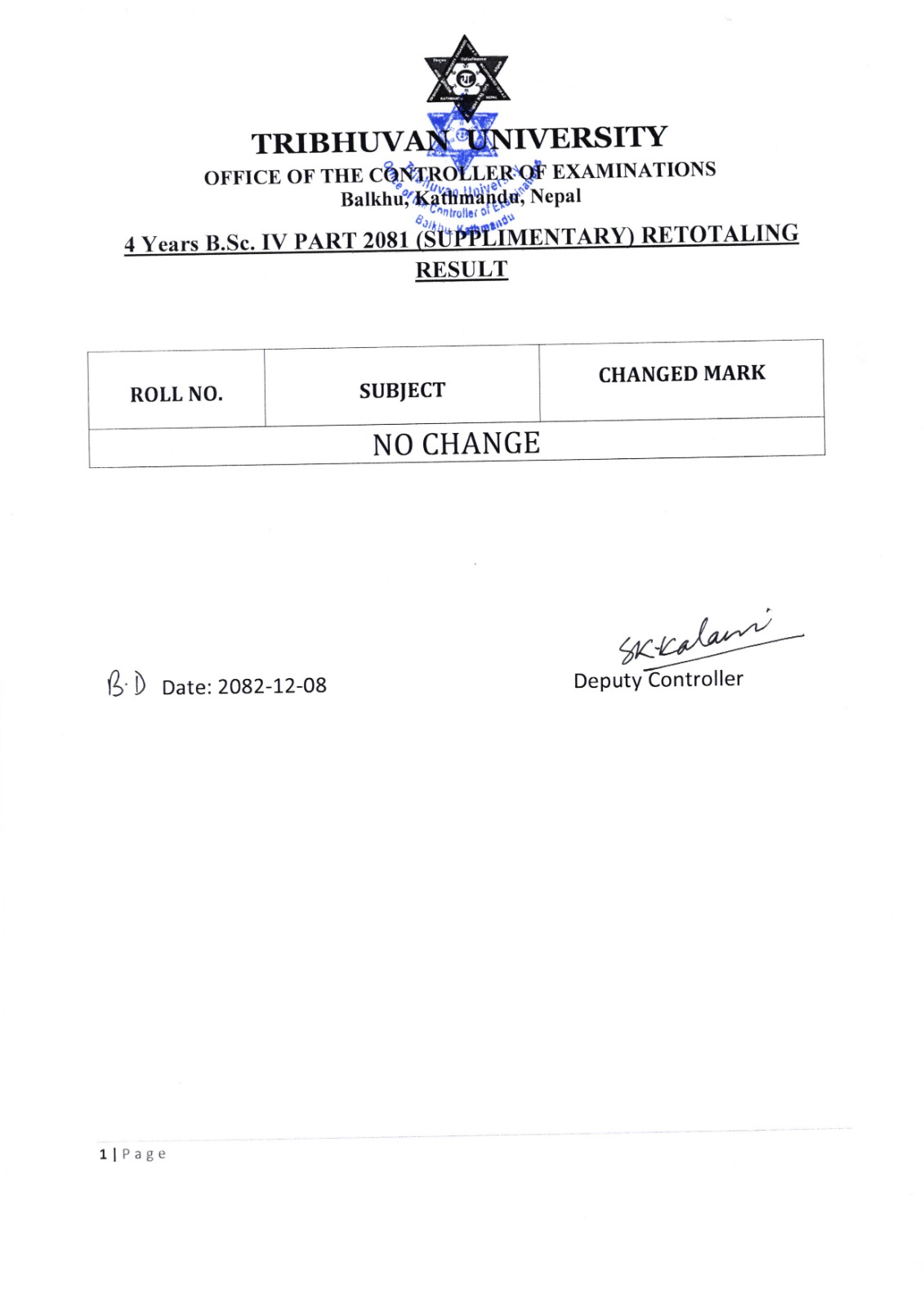 Retotaling Result: 4 -Yrs Bsc Part-IV Supplementry - 2081