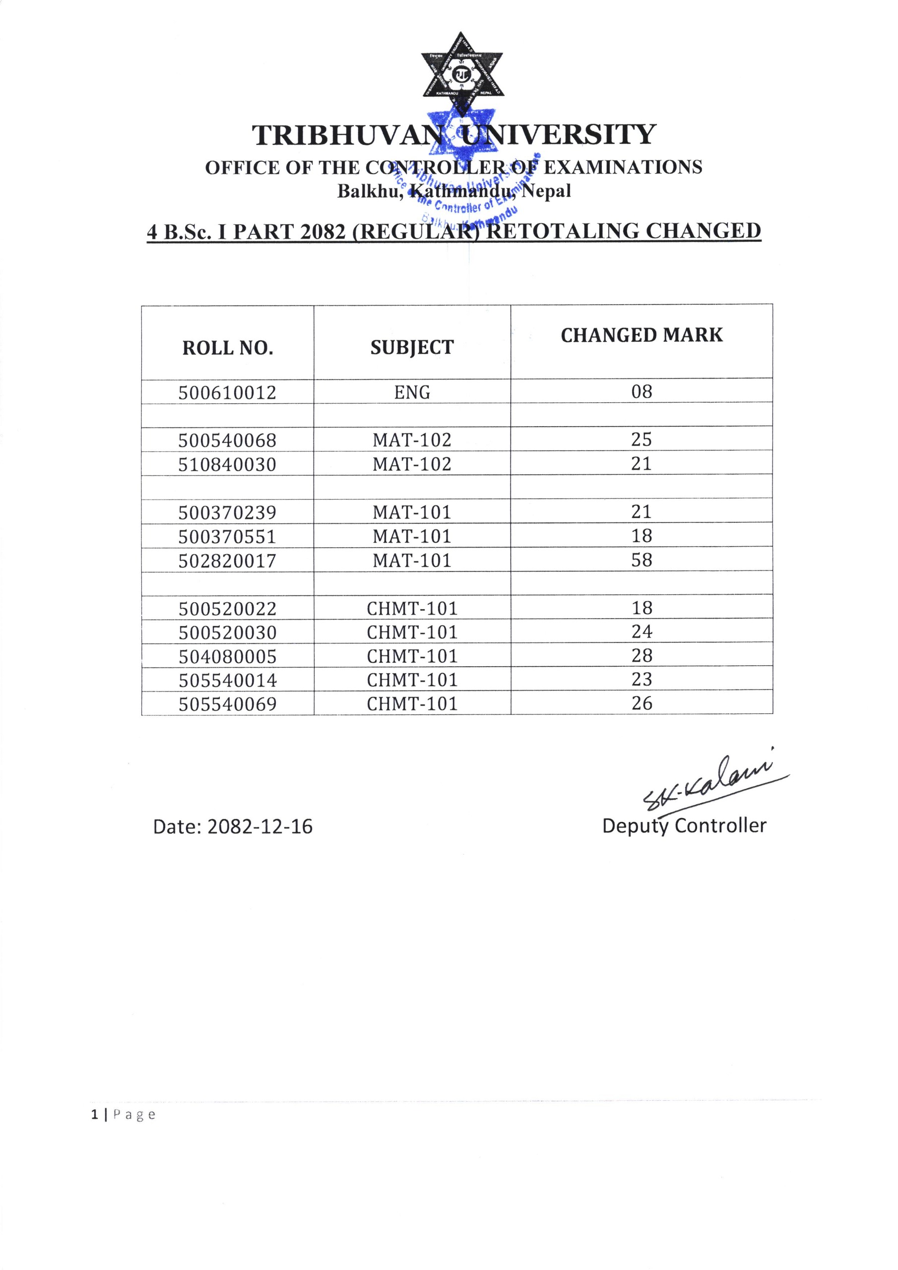 4 Years B.Sc. First Year 2082 Regular Retotaling Result Published Notice.