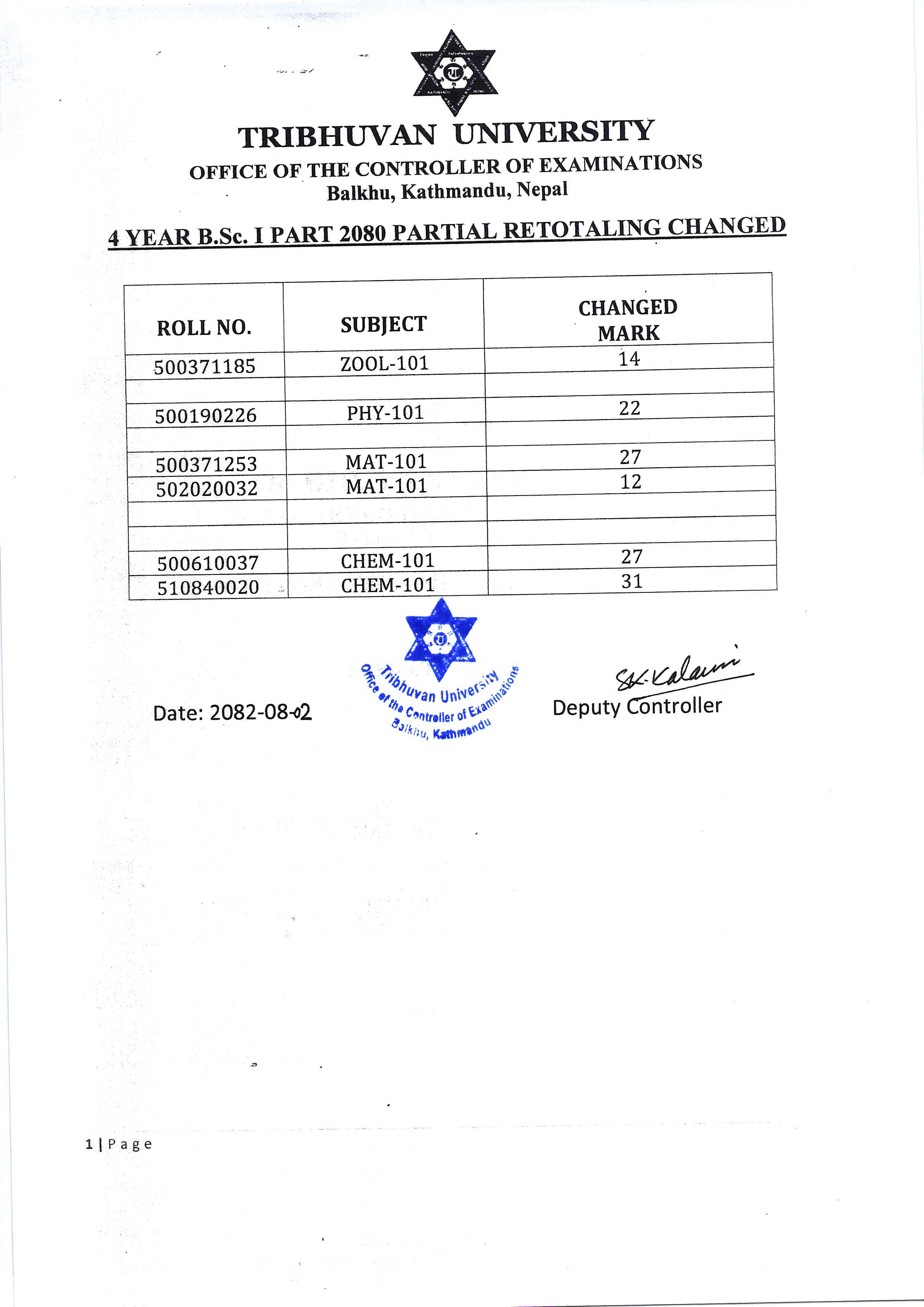 4 Yrs BSc First Part 2080 Partial Retotaling Result